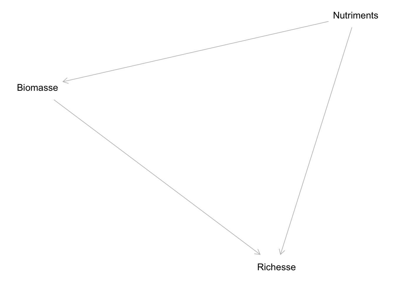 Donc : la Biomasse n’a PAS d’effet sur la Richesse. Leur corrélation existe uniquement parce qu’elles sont toutes deux causées par l’apport en Nutriments.