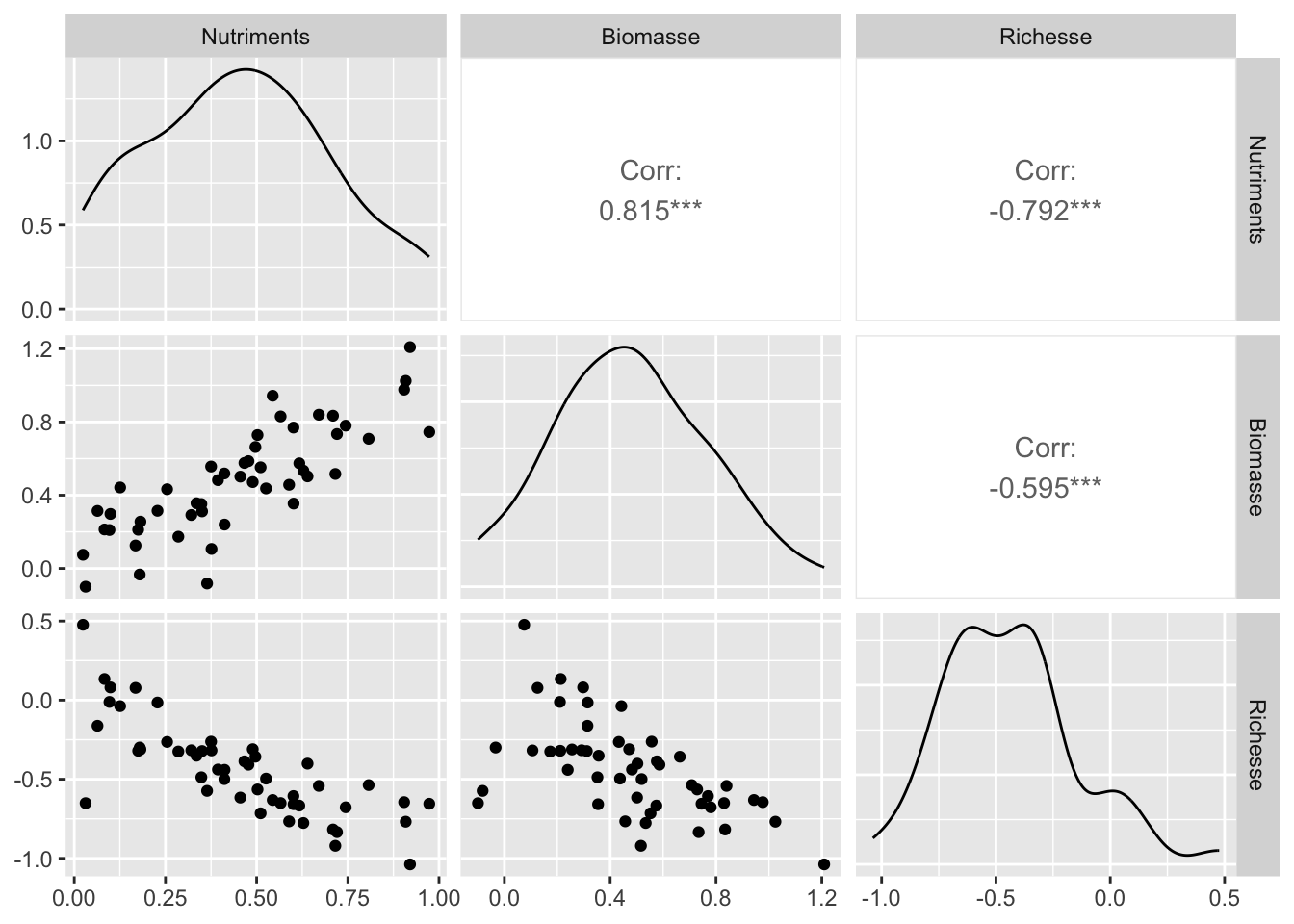 Si on explore visuellement ces données, on voit clairement la corrélation entre les Nutriments et la Richesse, mais aussi celle entre la Biomasse et la Richesse et celle entre les Nutriments et la Biomasse :