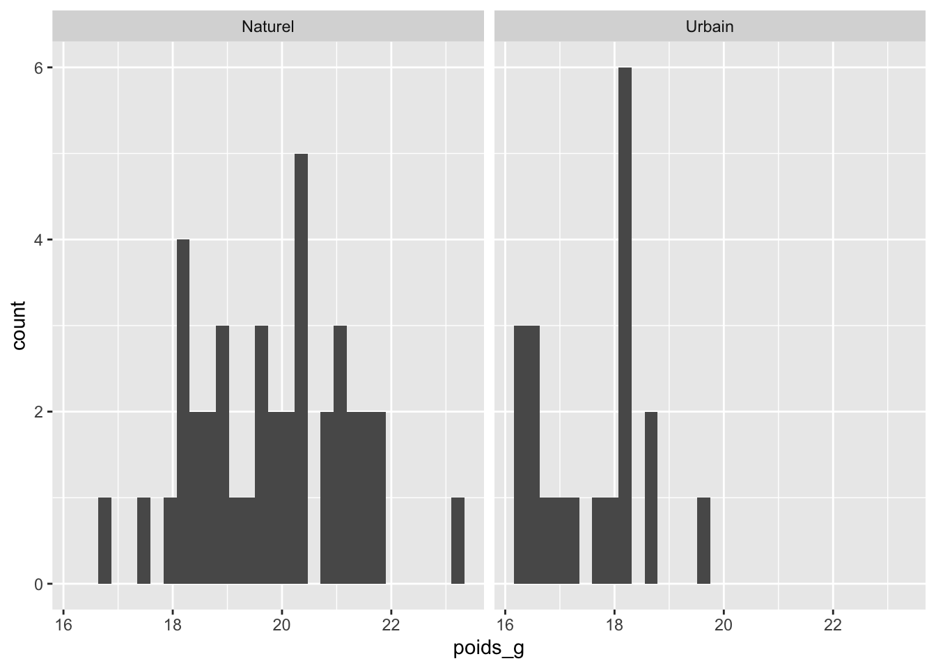 Pour notre exemple sur les oiseaux, nos hypothèses statistiques seraient donc les suivantes : \[ \begin{aligned} H_0 : \mu_{urbain} = \mu_{naturel}\\ H_1 : \mu_{urbain} \ne \mu_{naturel} \end{aligned} \]