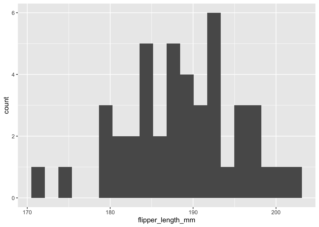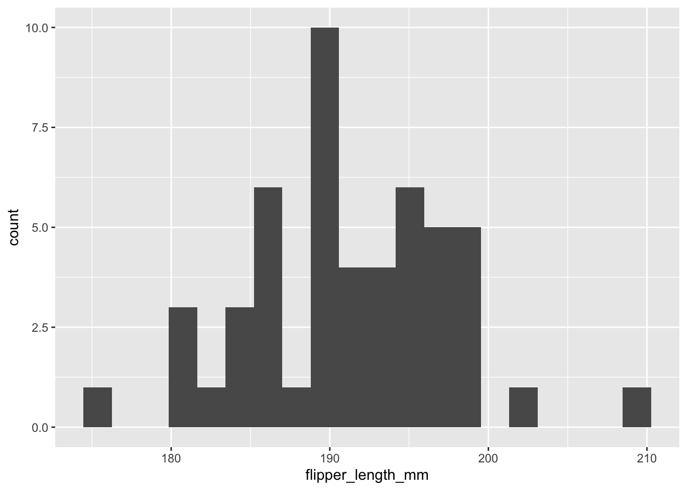 geom_histogram(aes(x = flipper_length_mm), bins = 20)