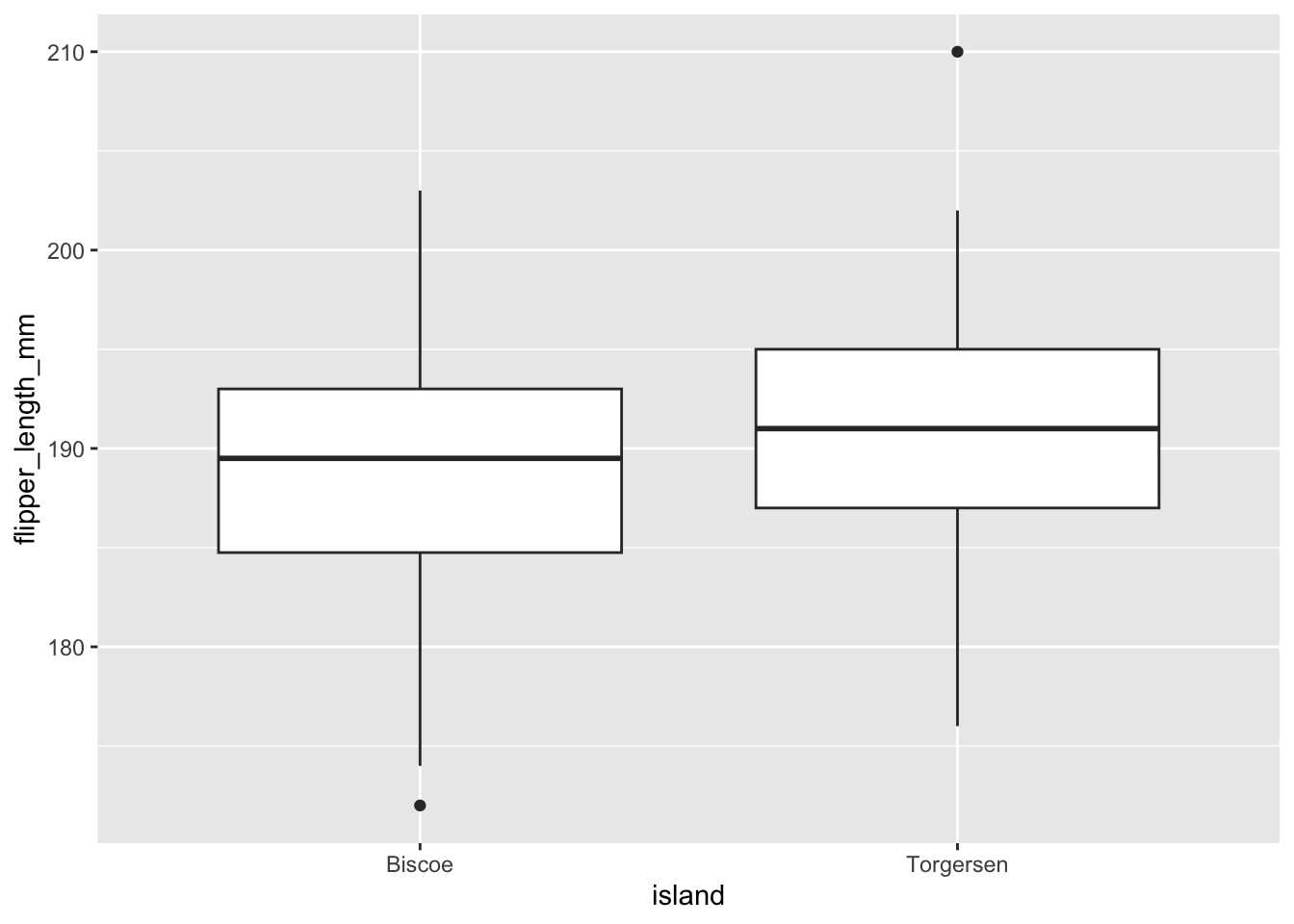 \[ \begin{aligned} H_0 = \mu_{Torgersen} = \mu_{Biscoe}\\ H_1 = \mu_{Torgersen} \ne \mu_{Biscoe} \end{aligned} \]