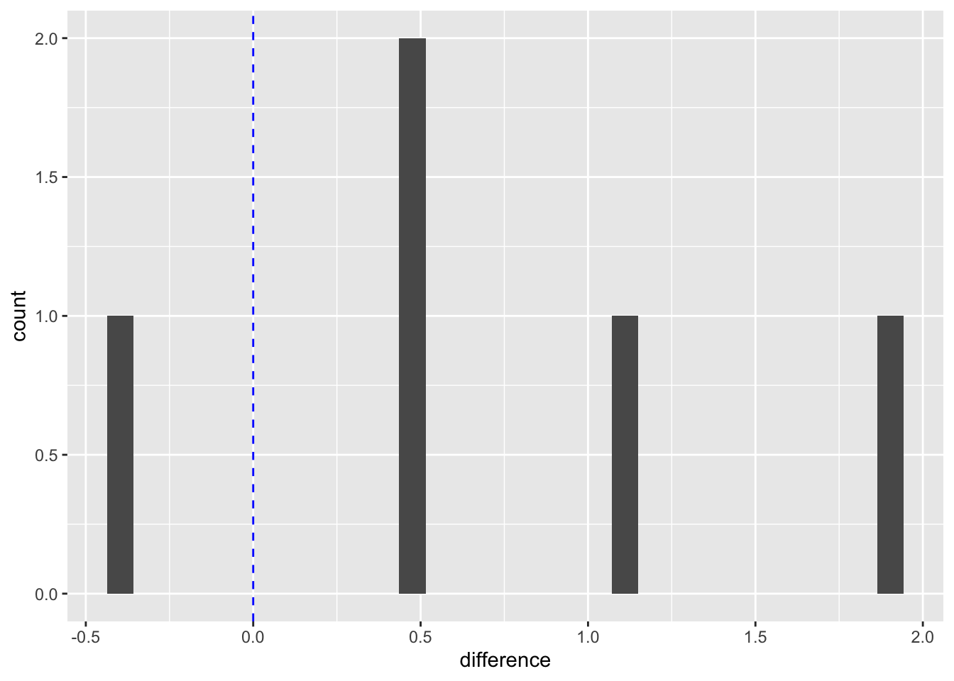 Pour le test de T pairé, on peut en un seul graphique valider l’assomption de normalité de la différence, et aussi visualiser la magnitude de l’effet. Pour se faire, nous créons un histogramme, auquel nous ajoutons une couche de ligne verticale, permettant de voir la valeur de référence (dans notre cas, zéro) :